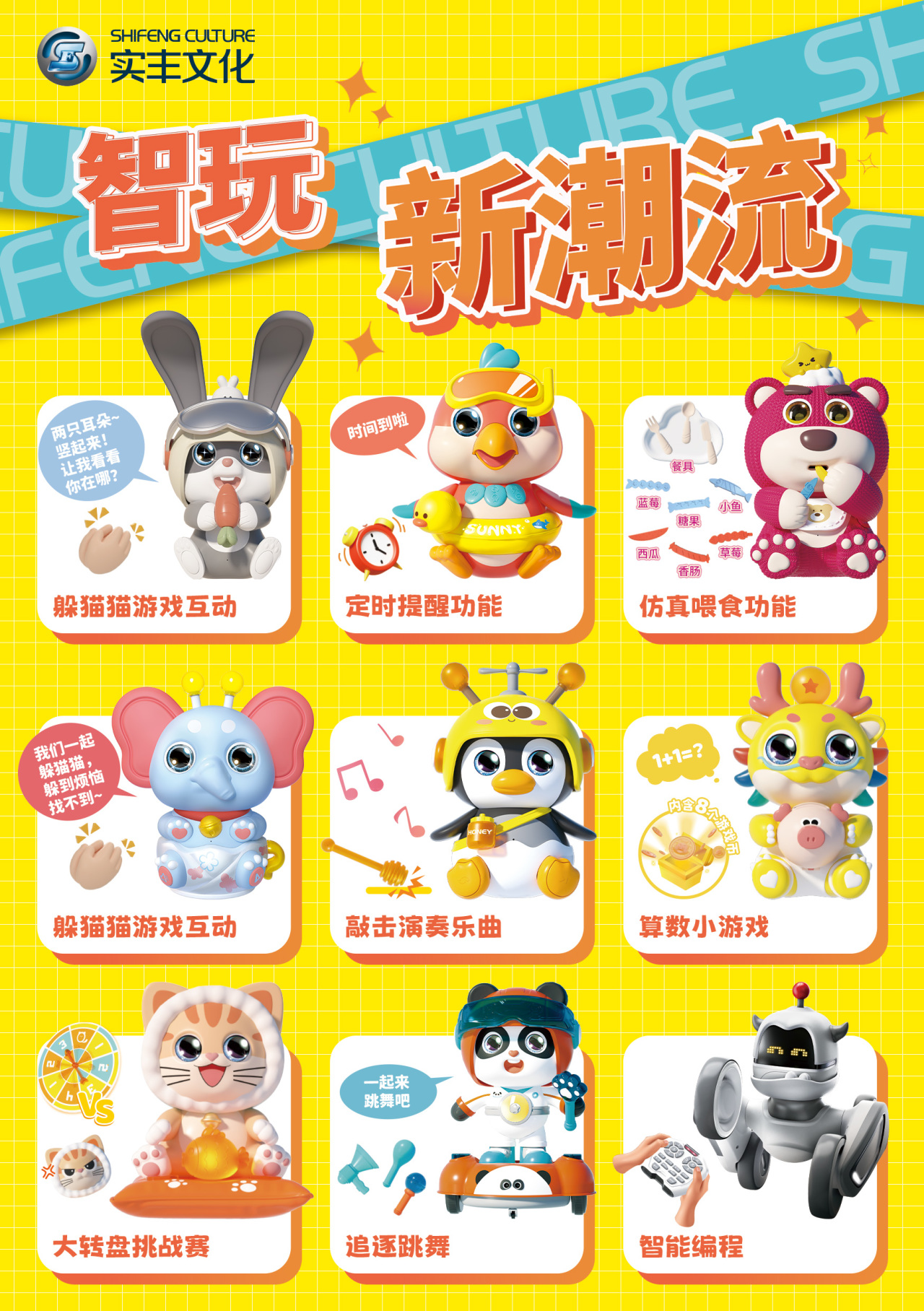 實(shí)豐文化作為國內(nèi)外知名的玩具制造商,擁有32年的行業(yè)經(jīng)驗(yàn),公司已形成“智能電動(dòng)玩具、IP動(dòng)漫衍生品玩具、潮流玩具”三大主要產(chǎn)品線。公司智能玩具系列融合了多種先進(jìn)的科技元素,如GPT大模型、編程、震動(dòng)感應(yīng)等新技術(shù),打造了智能飛飛兔、企鵝嗡嗡、智能小怪獸、炫舞星際熊貓、摸魚懶懶貓等多款熱銷智能玩具。